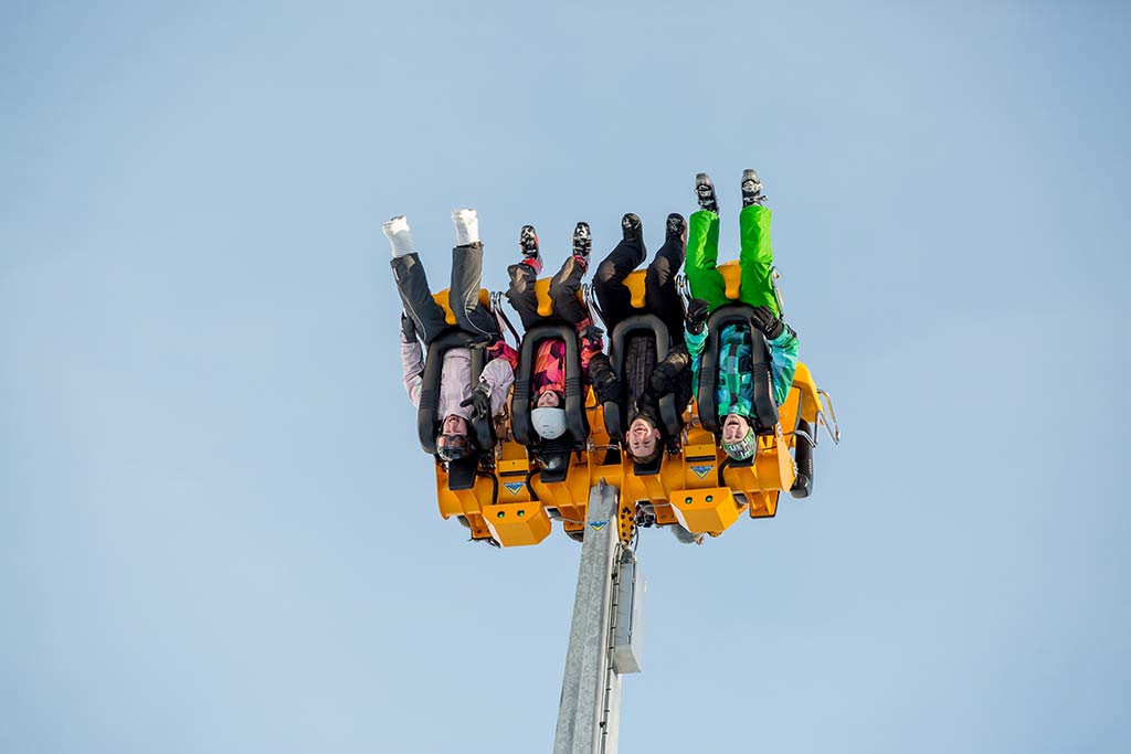 In der Riesenschaukel erleben bis zu 6 Personen gleichzeitig für wenige Augenblicke im freien Fall das atemberaubende Gefühl der Schwerelosigkeit. 22 m über dem Boden, 12 m freier Fall und 65 km/h machen diesen ultimativen Adrenalinkick möglich. 3 Minuten lustvolles Kribbeln im Bauch, rasantes Auf und Ab zwischen 4G und Schweben.