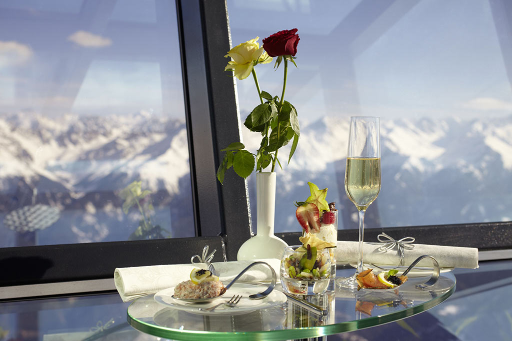 Lassen Sie sich verzaubern durch den 360° Rundum-Blick auf das winterliche Bergpanorama. Sie können zwischen 2 Varianten wählen: Sektfrühstück oder Luxury Lunch. Der Cube ist dann 2 Stunden ganz exklusiv nur für Sie reserviert. Maximal 8 Personen.