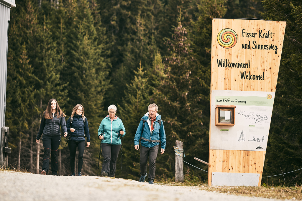 The route leads from the Fisser Kraft- & Sinnesweg to Frommes Alp, combining nature experiences with playful knowledge.