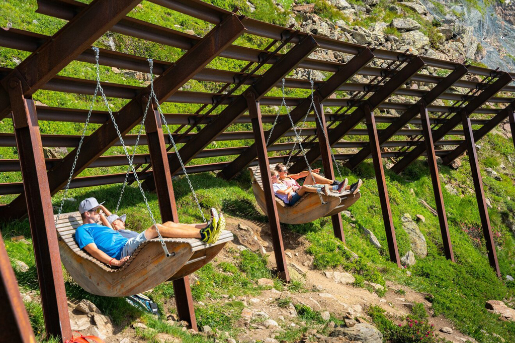 From the Summer Fun Park Fiss on the Möseralm, start out by passing by the Sunliner mountain station headed toward Serfaus. You need only light footgear to hike over 2,400 metres above sea level for a one-of-a-kind Alpine adventure. Stop and take a break now and again at the Enjoyment Pavilion, on the many benches for relaxing, or in the hammocks.