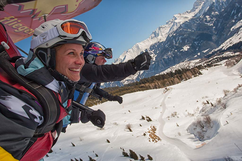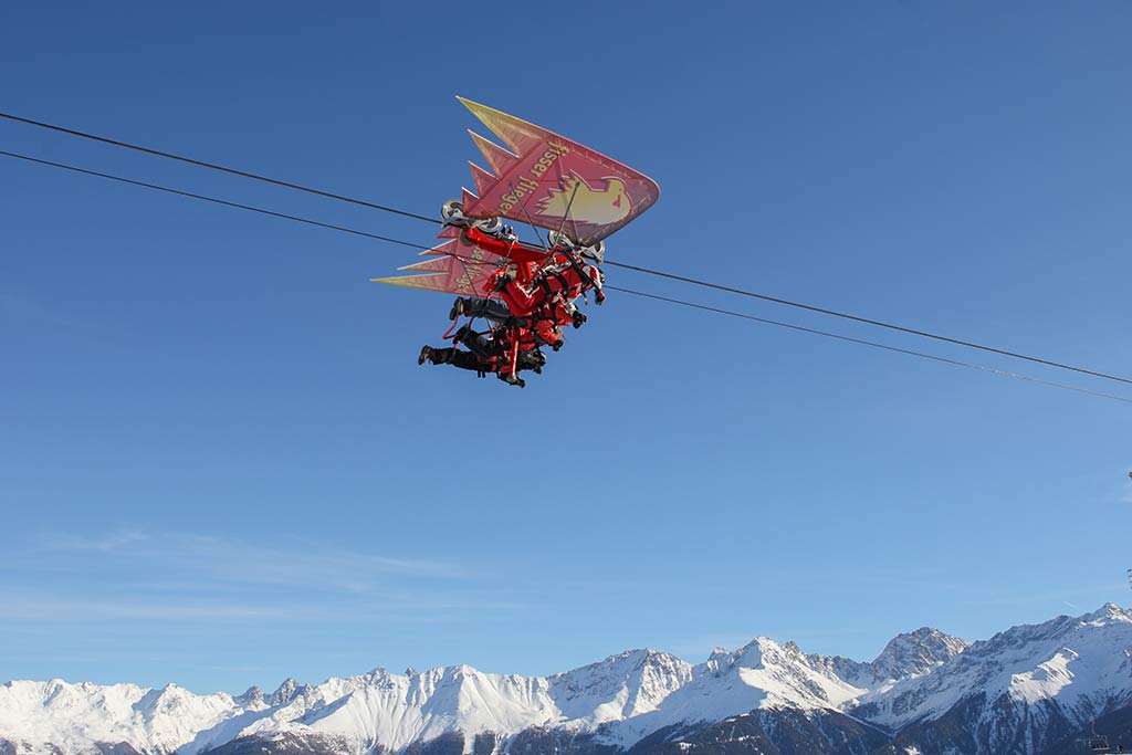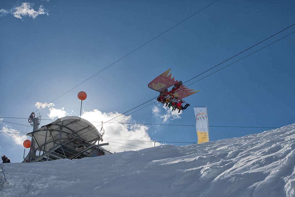This kite-like glider accommodates four passengers all at once, taking them on an unforgettable ride high above ground. A fixed steel cable guides the glider on wheels. The courageous fly up to 47 meters and up to 80 km/hour above the snow-covered meadow.